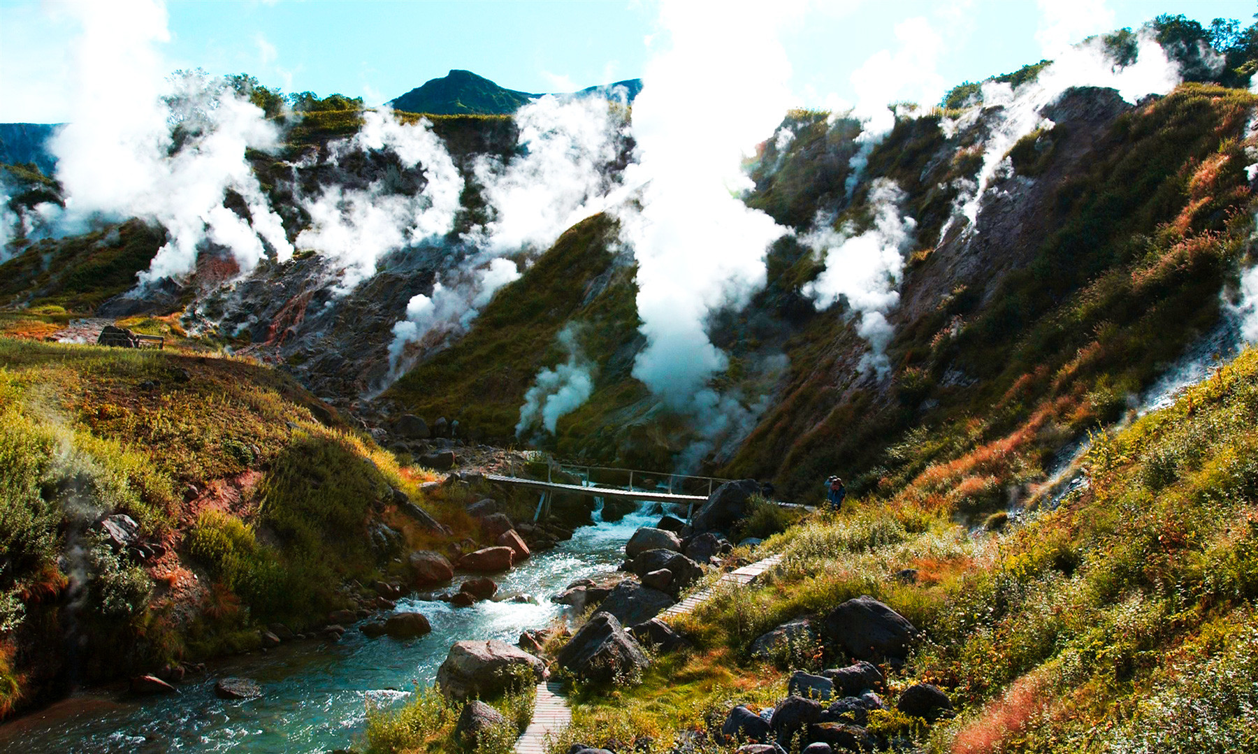 Na região do Kamtchatka também há 90 gêiseres – um dos vários tipos do vulcanismo secundário -, que expelem água fervente em meio a rochas verdes.