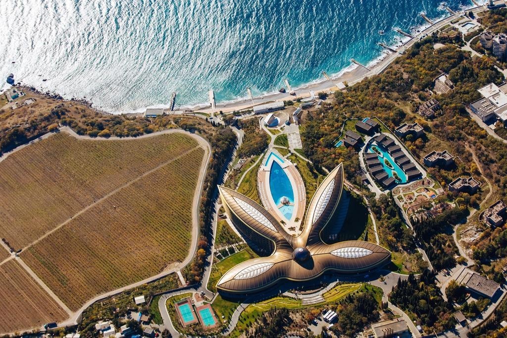 O hotel e spa projetado pelo arquiteto britânico Norman Forster, autor da London Millennium Bridge, fica a 25 quilômetros da cidade de Ialta. Em 2016, este hotel em forma de flor de lótus foi nomeado o melhor centro de lazer da Europa.