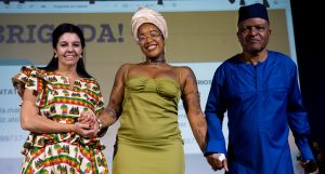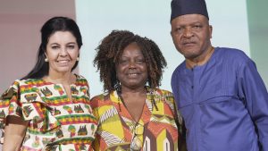 Diretora de Turismo da Costa do Marfim no Brasil, Jennifer Curcio; e oEmbaixador da Costa do Marfim no Brasil, Diamounténé Alassané Zié (E sua esposa Bibatta Quattara) presenteiam Sinara Rubia, Diretora do MUHCAB